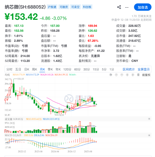 此前,纳芯微科创板IPO于2021年5月受理,不到一年便走完全部流程,最终于2022年4月登陆上交所。上市以来,该公司股价曾于2022年8月攀升至331.43元/股,对应市值高达472亿元。截至今日午间休市,纳芯微跌3.07%报153.42元/股,总市值约247.92亿元。